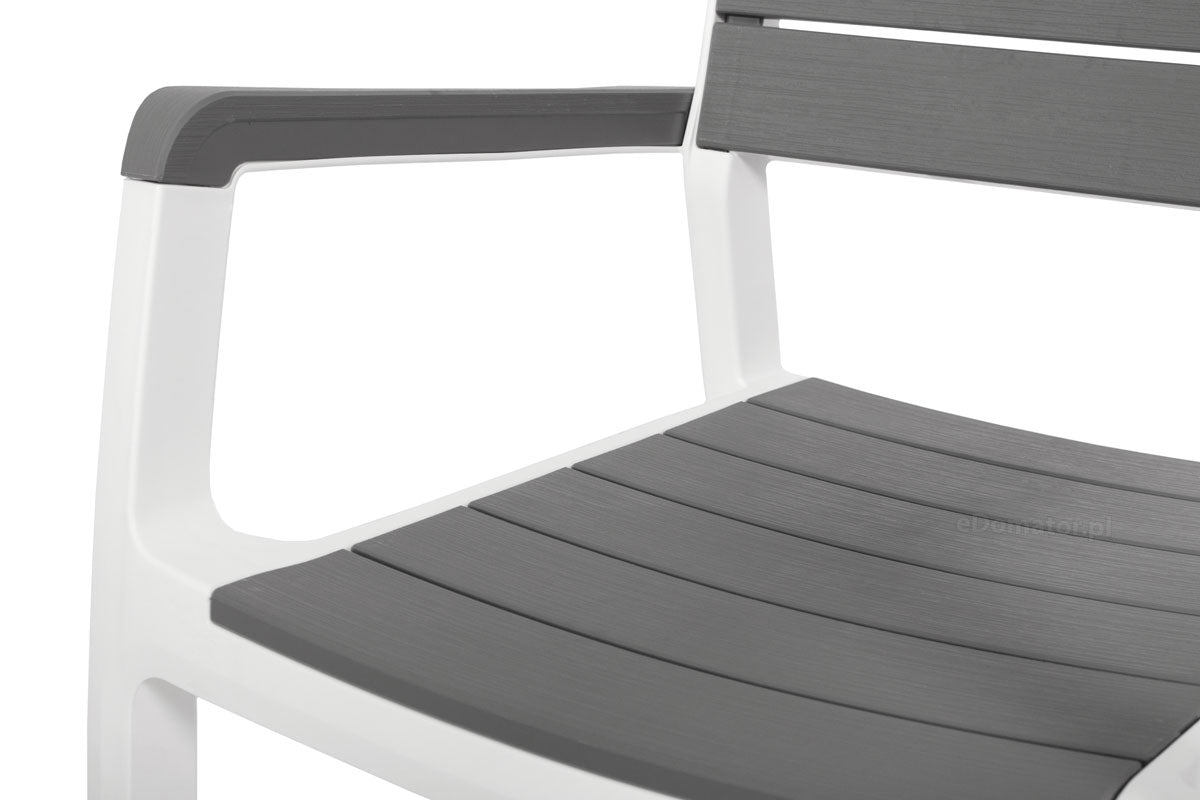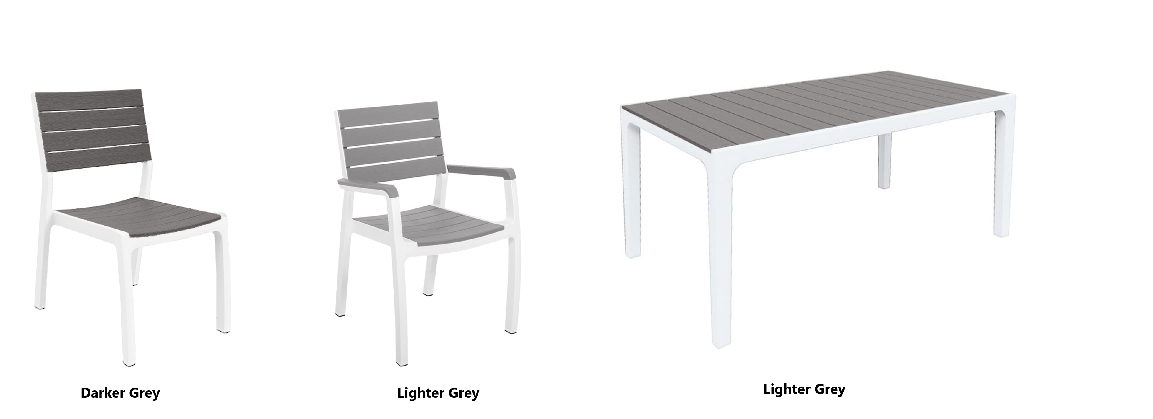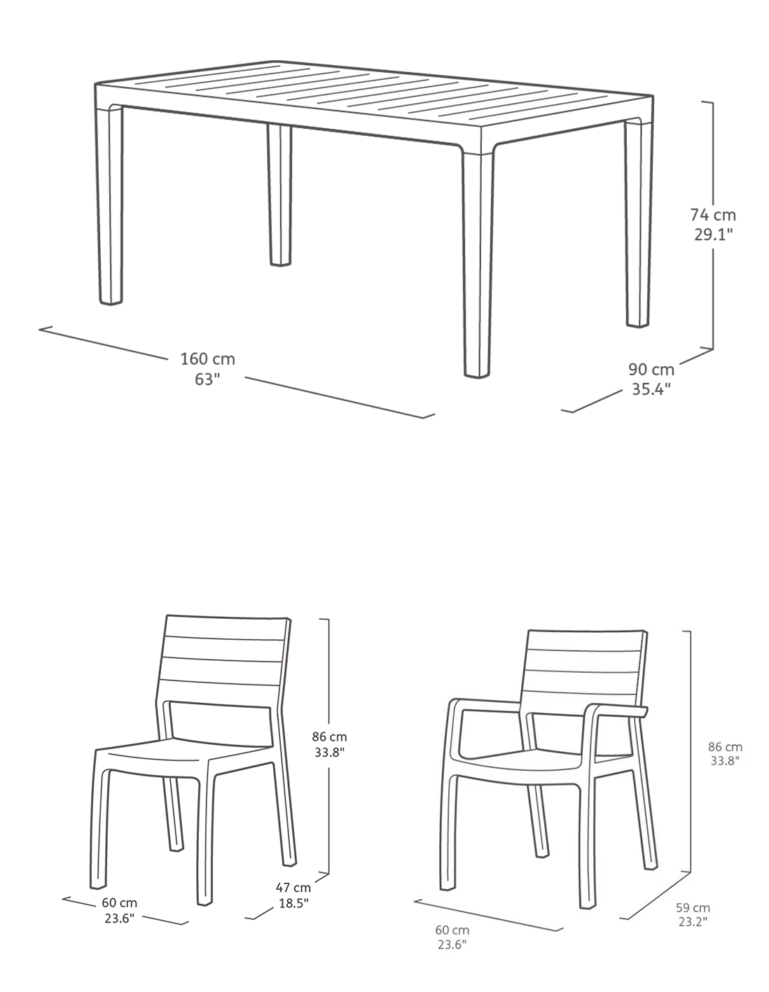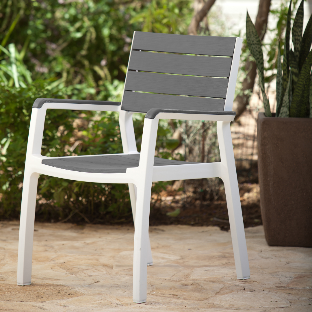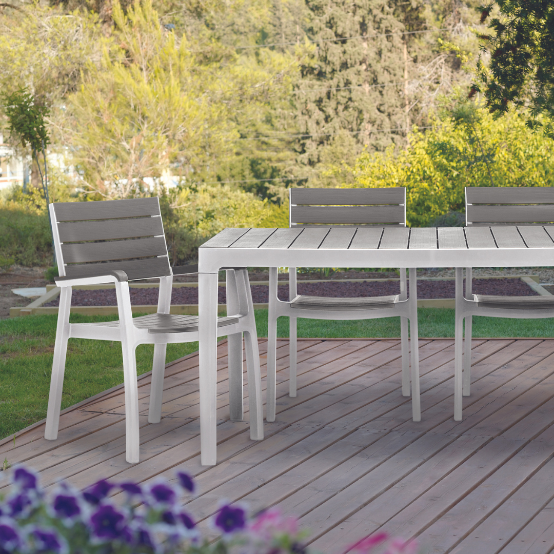 Manufactured Country Israel Colour Grey + White Code 17201231-SET2A4C Material Plastic/Polypropylene/ Resin Chair with Armrest Width 590mm Chair with Armrest Depth 600mm Chair with Armrest Height 860mm Chair without Armrest Width 470mm Chair without Armrest Depth 600mm Chair without Armrest Height 860mm Assembled Table Width 1600mm Assembled Table Depth 900mm Assembled Table Height 740mm Package Width - Table 1600mm Package Depth - Table 900mm Package Height - Table 96mm Package Width - Pallet 1700mm Package Depth - Pallet 1100mm Package Height - Pallet 800mm Product Weight - Chair 3.7kg Product Weight - Table 17kg Package Weight - Pallet 50kg (approx) Weight Capacity - Chair 110kg Delivery Entire Set delivered on a Pallet -