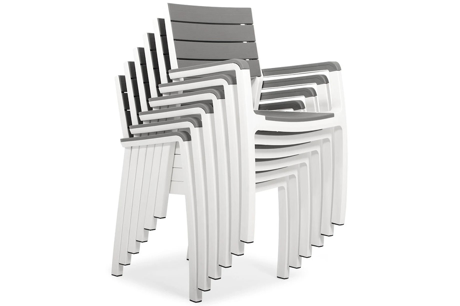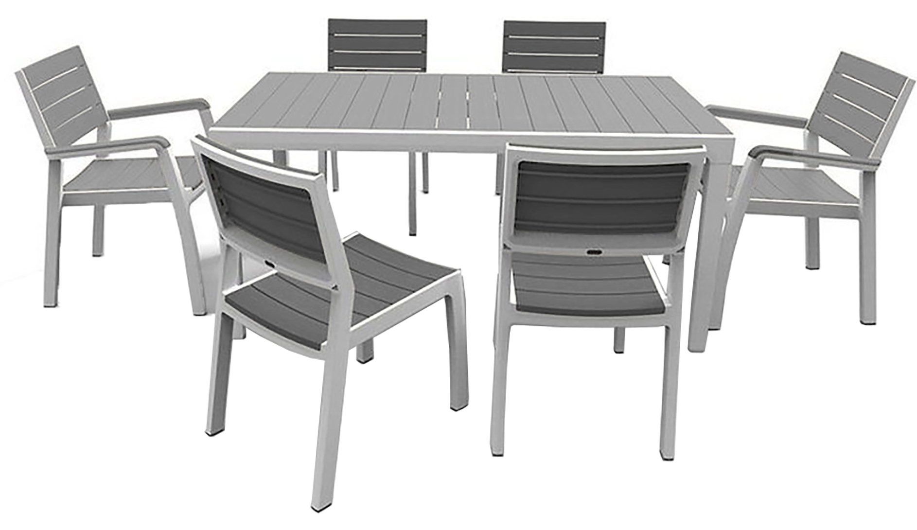 This Harmony Dining Set includes a Table and 6 Chairs, 2 with Armrests and 4 without Armrests, crafted with 50% regrind all weather resin for long-lasting durability. The UV-protected, wood-look texture offers sophisticated style, while the modern and elegant garden chair design with armrests stands up to the elements.