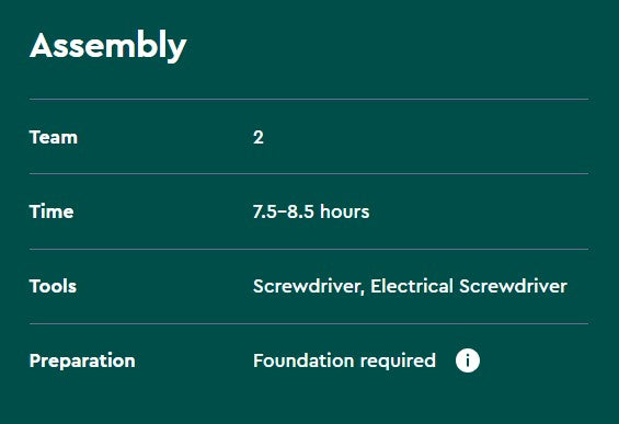 Colour Grey Width 2300 mm Depth 4760 mm Height 2460 mm Manufactured Country Israel Code 1721288-7515 Colour Dark Grey / Anthracite Foundation Required Yes External Assembled Dimensions 2300(W) x 4760(D) x 2460(H) mm Internal Assembled Dimensions 2010(W) x 4530(D) x 2340(H) mm Minimum Foundation Size 2100(W) x 4710(D) mm Entry Width 1388 mm Total No. of Packages 4 Package 1 (Newton Plus Pack A) Dimensions 2270(W) x 1320(D) x 230(H) mm Package 2 (Newton Plus Pack B) Dimensions 2270(W) x 1320(D) x 130(H) mm Package 3 (Newton Plus 4ft Kit) Dimensions 2270(W) x 1320(D) x 180(H) mm Package 4 (Newton Plus 4ft Kit) Dimensions 2270(W) x 1320(D) x 180(H) mm Package Weight 264.35 Kg Product Weight 234.25 Kg Snow Load Capacity 125 Kg/m2 Capacity 19.51m3 -