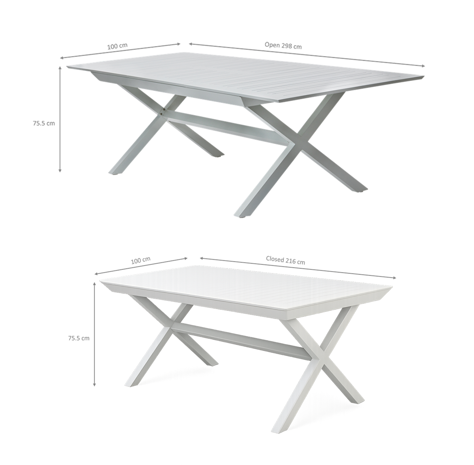 Colour White Width 2980 mm Depth 1000 mm Manufactured Country China Code 823902 Colour White Table Capacity 6-10 people Assembled Table Open Width 2980 mm Assembled Table Closed Width 2160 mm Assembled Table Depth 1000 mm Assembled Table Height 755 mm Package Width 2230 mm Package Depth 1100 mm Package Height 190 mm Product Weight 37 Kg Package Weight 43 Kg -