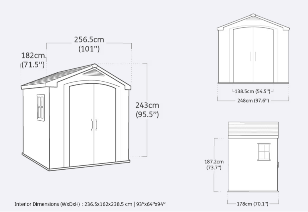 Colour Beige Width 2565 mm Depth 1820 mm Height 2430 mm Manufactured Country Israel Colour Taupe / Beige Code 17197897 Internal Width 2365mm Internal Depth 1620mm Internal Height 2385mm Exterior Width 2565mm Exterior Depth 1820mm Exterior Height 2430mm Package Width 1985mm Package Depth 1130mm Package Height 484mm Product Weight 111 kgs Package Weight 123.2 kgs Door Opening Dimensions Width 1385mm Dimensions for concrete slab (front x side) 1955mm x 2565mm -