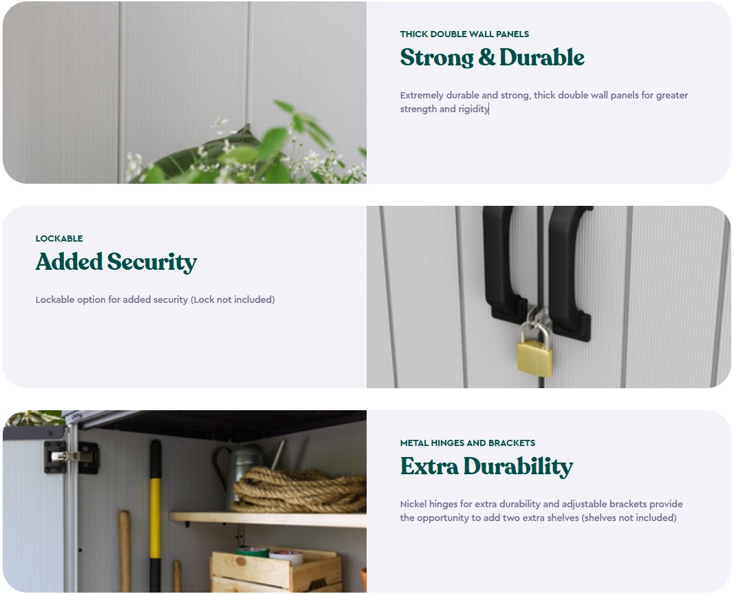 The rib-reinforced, double-walled resin construction delivers exceptional durability standing strong against the elements without fading, peeling, rotting, or requiring maintenance.