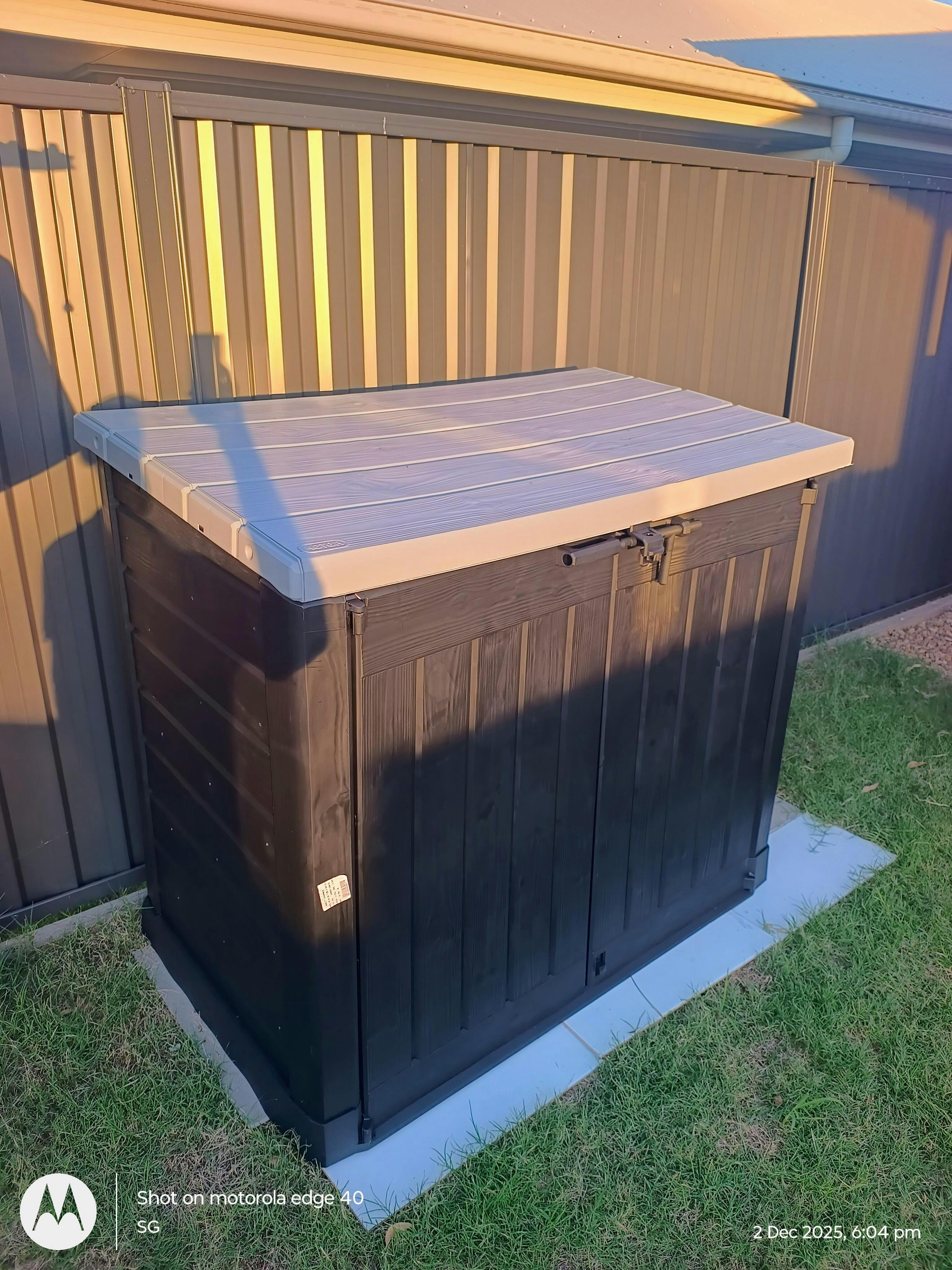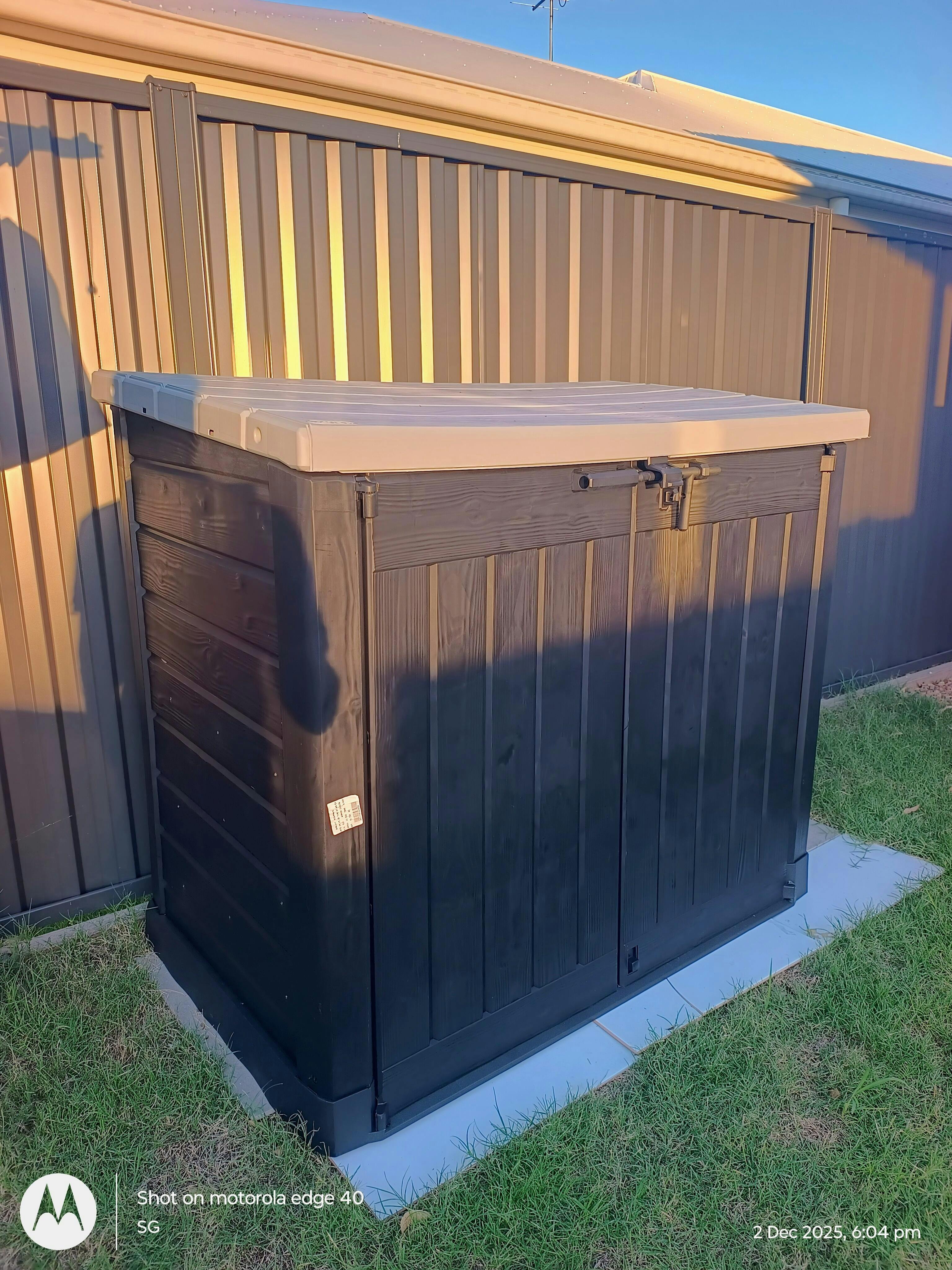 The Store It Out Max is a durable, fully weather resistant storage shed with sloped threshold for easy wheeled access. Features include a 1200lt capacity, easy to open gas strut assisted lid, lockable double doors, floor panel and bonus bin opening kit.