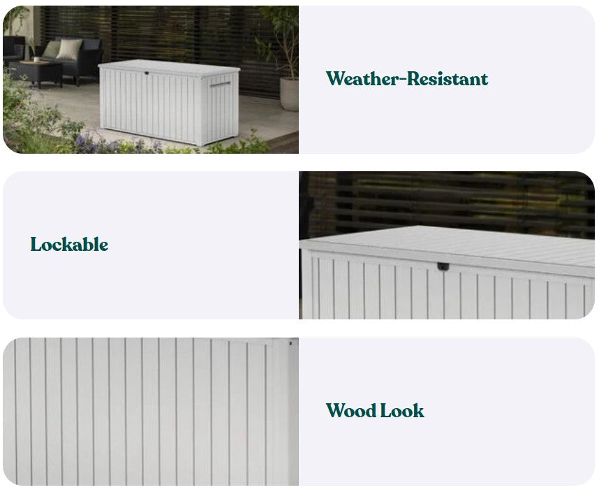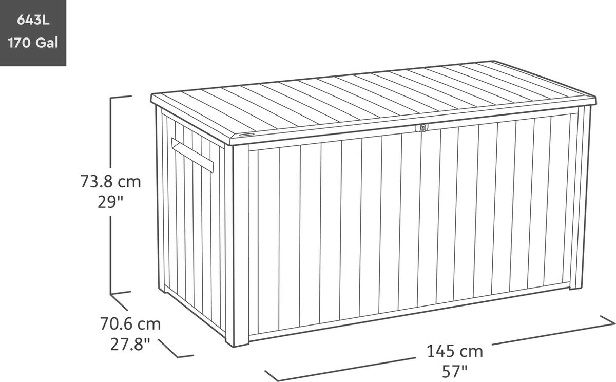 - Extra‑large 643L capacity – ideal for cushions, garden tools, pool accessories, toys and more