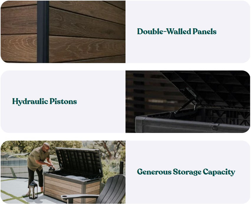 Double‑walled resin construction stands up to every season, won’t fade, rot, peel, or rust, while built‑in ventilation keeps contents fresh and dry. The hydraulic easy‑lift, soft‑close lid makes access smooth and safe, and the lockable top (lock not included) adds peace of mind.
