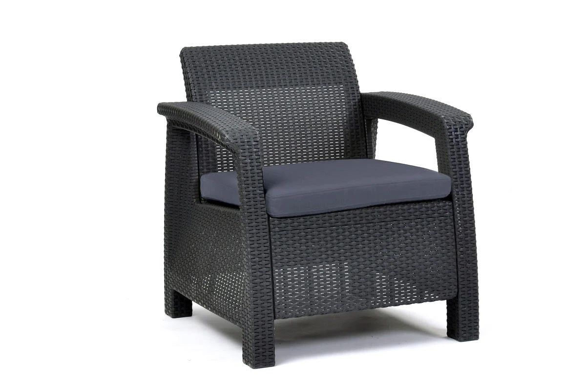 Includes: 2 x Corfu Arm chairs | 1 x Corfu Coffee Table | 2 x Weather proof seat cushions