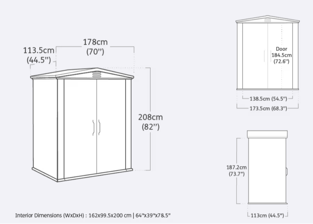 Colour Beige Width 1780 mm Depth 1135 mm Height 2080 mm Manufactured Country Israel Colour Taupe / Beige Code 17197903 Internal Width 1620mm Internal Depth 995mm Internal Height 2000mm Exterior Width 1780mm Exterior Depth 1135mm Exterior Height 2080mm Package Width 1980mm Package Depth 1140mm Package Height 275mm Product Weight 63kg Package Weight 69.9kg Door Opening Dimensions Height 1845mm Door Opening Dimensions Width 1385mm External Dimension (Concrete Slab Size Side D) 1135mm External Dimension (Concrete Slab Size Front W) 1780mm -