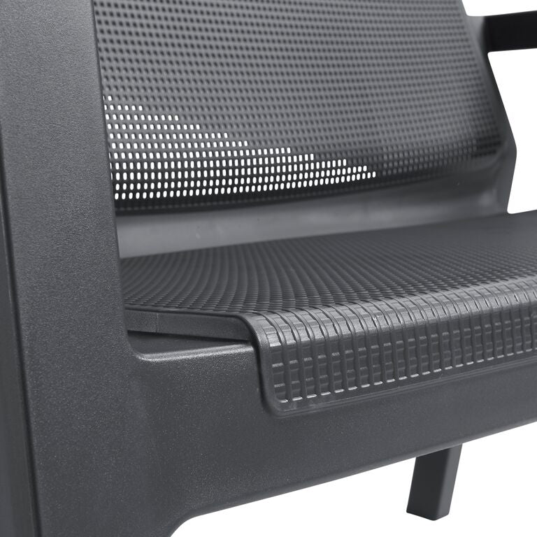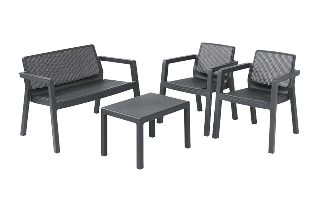 Unwind instantly, assembly takes just five minutes and requires zero tools! This compact set includes two spacious armchairs, a cozy 2-seater sofa, and a stylish coffee table, all crafted from durable, weather-resistant resin.