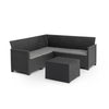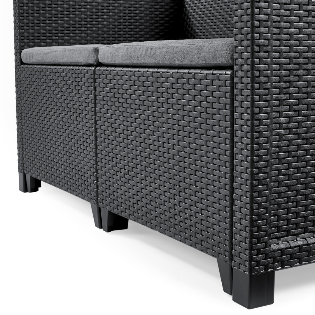 The included table is the ideal spot to rest your drinks and snacks. A modern graphite colour with contrasting grey cushions, it will look super sophisticated sitting on your patio. Easy to both assemble and maintain, this is the sure choice for any family looking for an easy place to relax in the sun.Ideal outdoor corner lounge set for gardens, conservatories and entertaining spaces. Built for comfort, with ergonomic backrest and strong flat wicker design. Sleek and sophisticated corner garden furniture set with a rattan - style that is durable, weather resistant and low maintenance