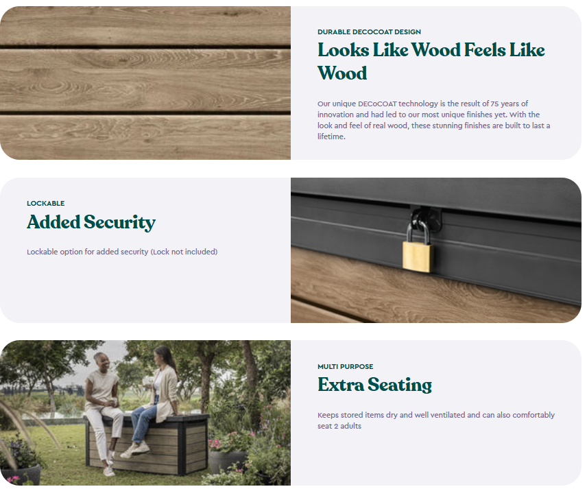 Showcase-worthy and built to last, the Signature 570L Deck Box is the crown jewel of our Signature Collection. Inspired by nature and finished with a premium DecoCoat wood-look texture, it delivers the warmth of timber without the upkeep.