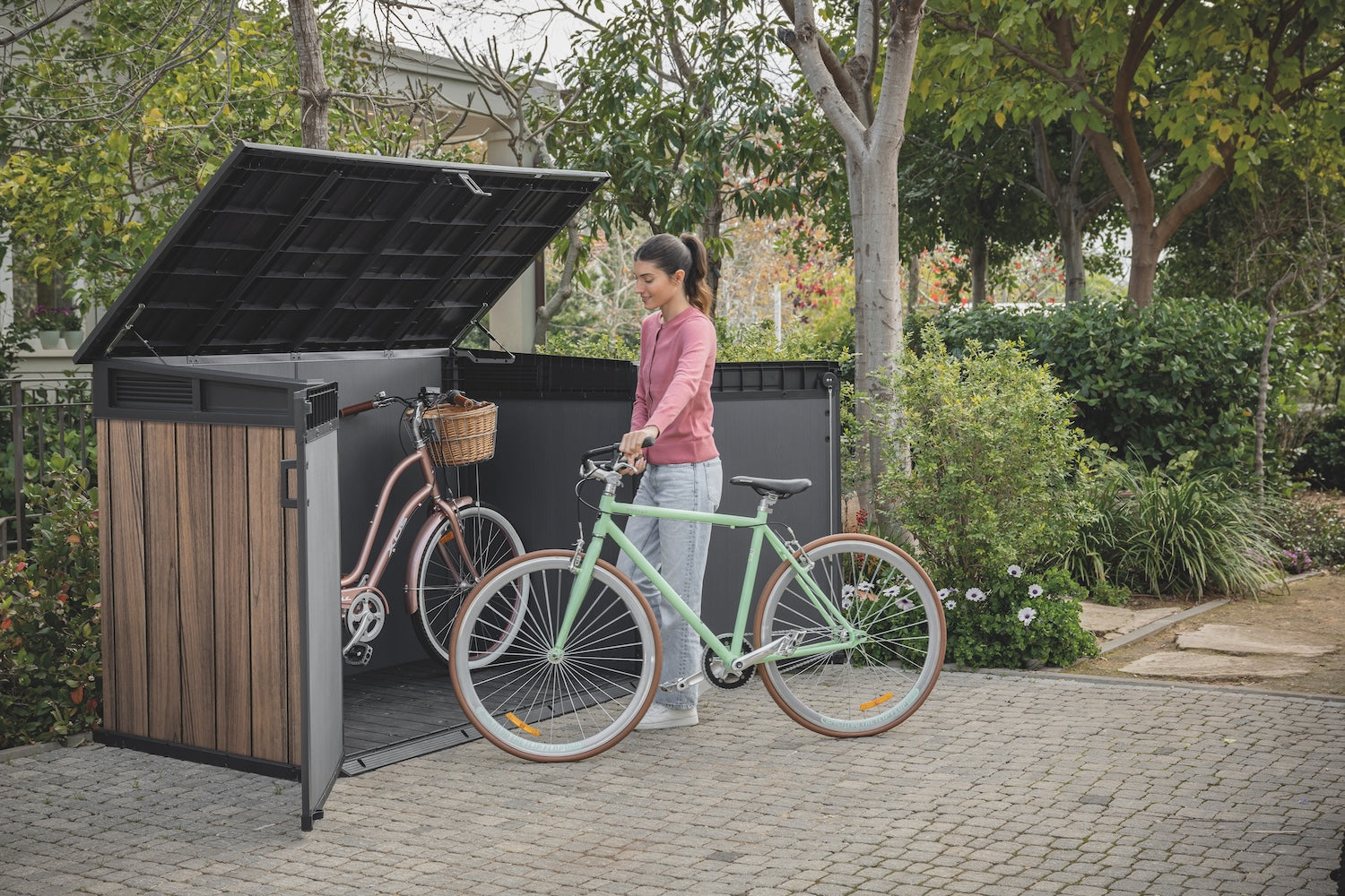 Keep your outdoor space organized and stylish with our premium shed, designed to securely store bicycles, garbage cans, and more behind lockable doors.