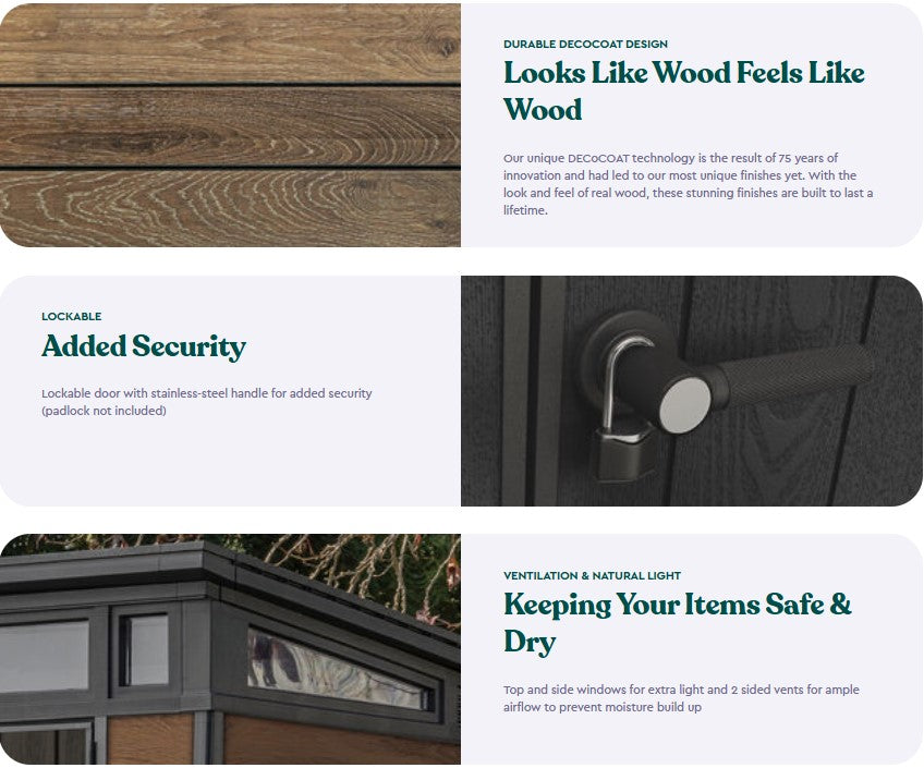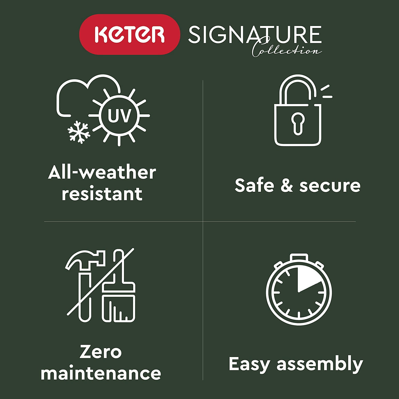 The realistic wood-look walls are made from our innovative, cutting-edge composite material. That means it won’t chip, peel, flake, rot, or sustain water damage. And it’s completely maintenance-free and weather-resistant. In fact, its steel-reinforced roof can withstand up to 200kg/sqm of snow. Inside, 8.4 cubic meters of space gives plenty of room for your outdoor gear, which can be kept neatly organized with the addition of the Keter Shelf Kit.